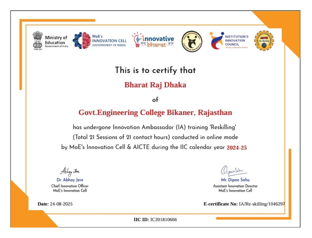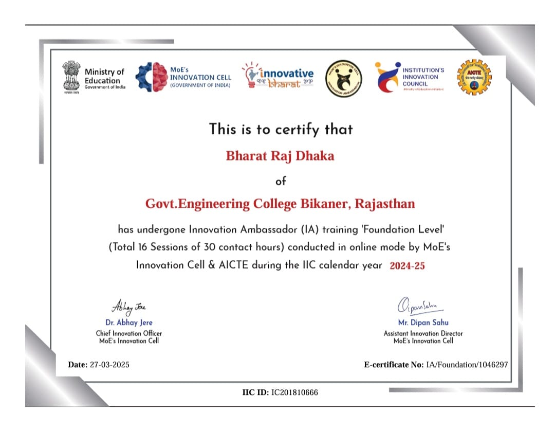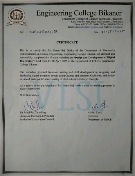 At Govt. Engineering College Bikaner, I actively work with two labs: the Innovation Centre & Product Design Lab and the VLSI & AI Lab.